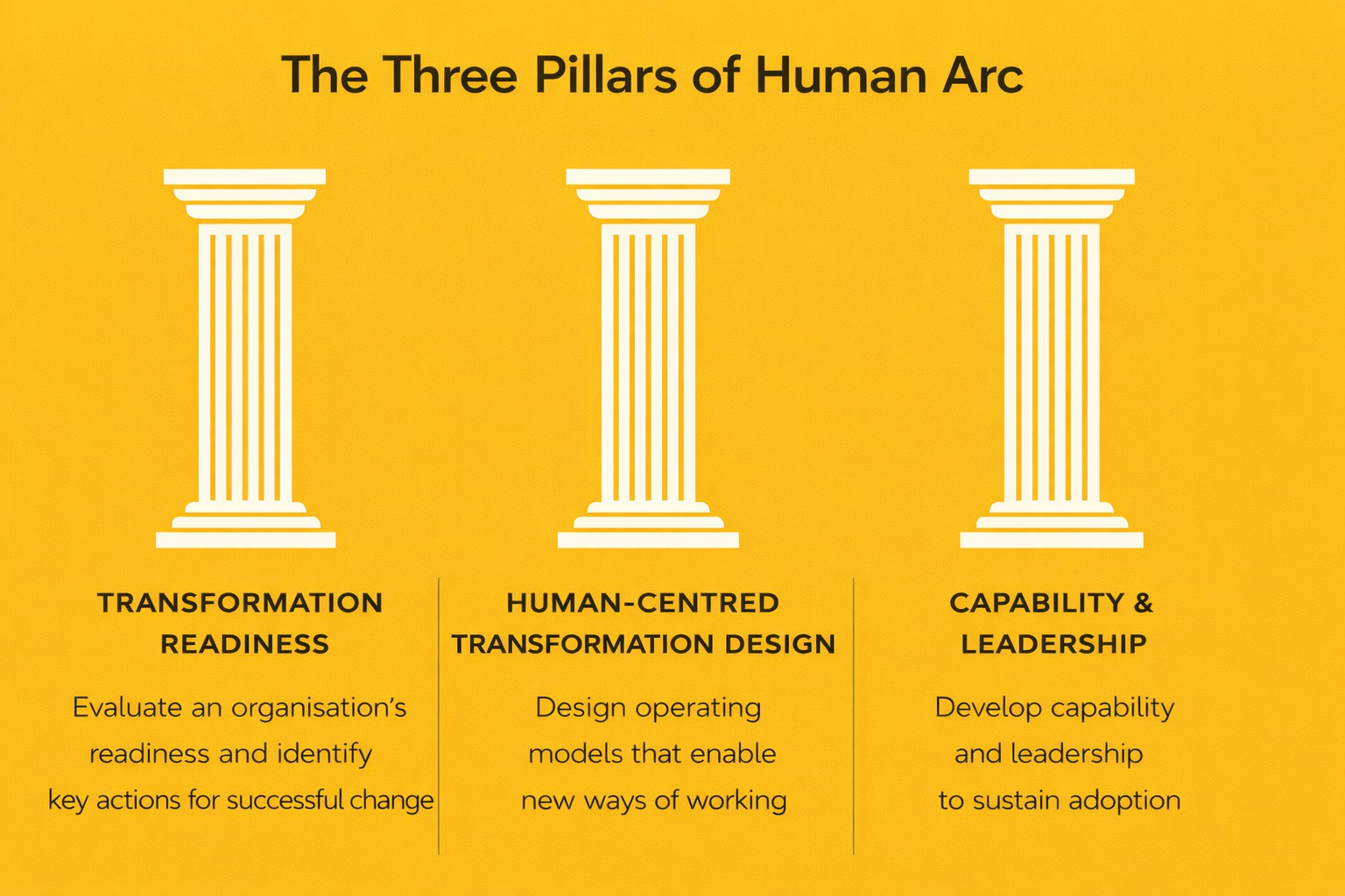 Together, these pillars enable Human Arc to help organisations assess readiness, design human-centred transformation approaches, and develop the capability needed to translate technological innovation into real organisational impact.
